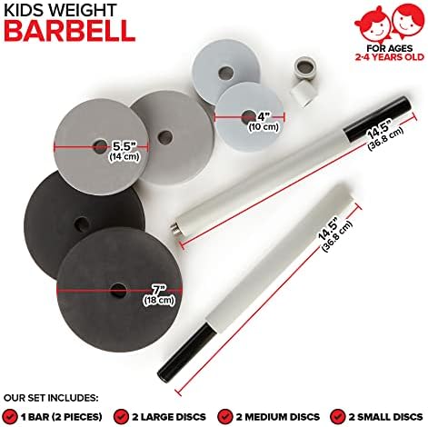 Includes 1 gray bar (2 pieces), 2 large black discs, 2 medium gray dics, and 2 small gray discs. Dimensions: Bar – 29” (74 cm); Large Disc – 7” (18 cm); Medium Disc – 5.5” (14 cm); Small Disc – 4” (10 cm). Recommend for ages 2 to 4 years.