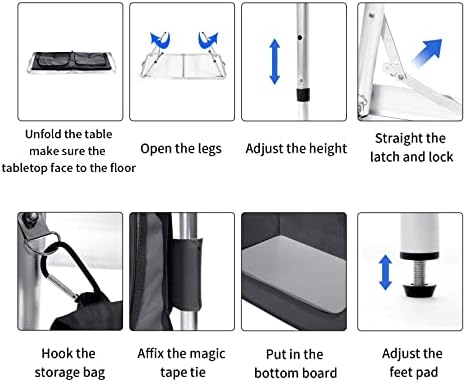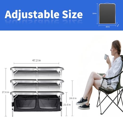Foldable table – Moosinily adjustable folding table is eay to use, could be installed within 3mins. 3 levels adjustable legs could lifted from 21.5-27.5 inch. The Oxford camping bag is easy to fold and unfold. At the bottom of the legs are 4 adjustable screw rubber feet which could fit unflat floor
