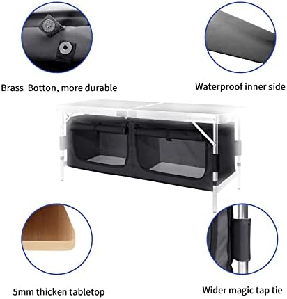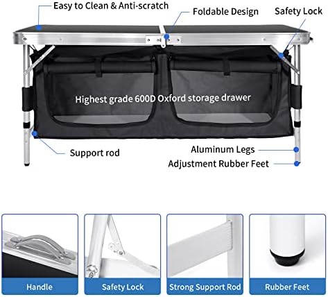 Moosinily 4 Feet Folding Table Aluminum Portable Camping Table Adjustable Picnic Table with Oxford Storage Organizers for Outdoor Travel Beach Backyards BBQ Party Picnic Black