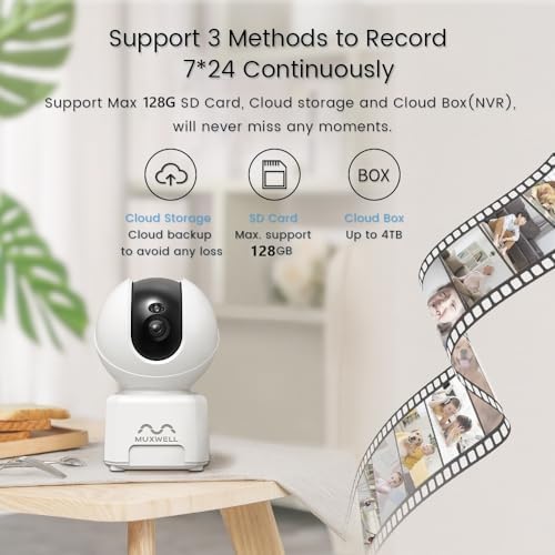 [24/7 Security Protection for Your Around] – MUXWELL Indoor Security Camera manages 24/7 protection for baby / elder / pets / dog / cat / home / office / garage. It supports all WiFi both 2.4GHz & 5GHz. You can keep an eye on your home anytime anywhere, optional Cloud Storage & Local Storage (compatible with Micro SD card, up to 128GB).
