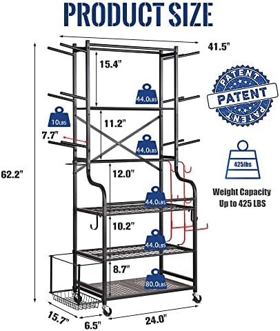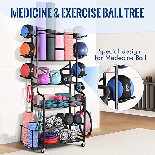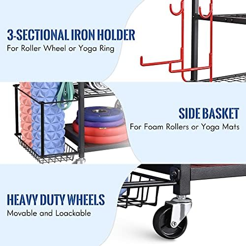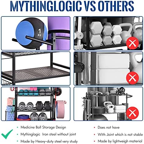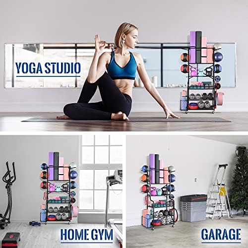 Mythinglogic Yoga Mat Storage Racks,Home Gym Storage Rack for Dumbbells Kettlebells Foam Roller, Yoga Strap and Resistance Bands, Workout Equipment Storage Organizer With Hooks and Wheels