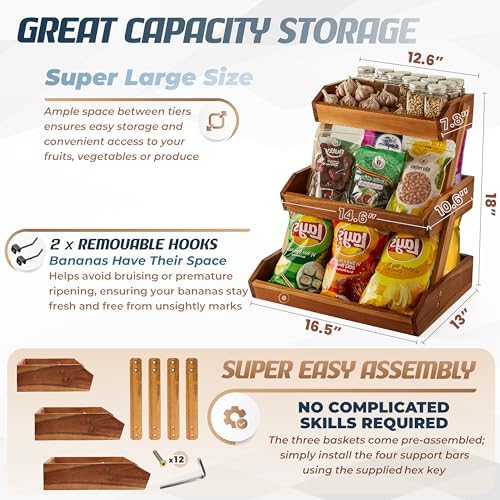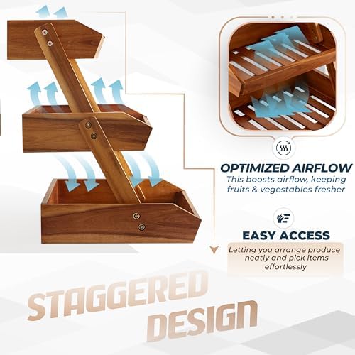 Natural Acacia PerfectionSuper Large 3-Tier DesignOptimized Airflow for Freshness2 Removable Banana Hooks Dimension: 16.5”(L) x 13”(W) x 18” (H)