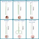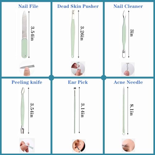 Nail Cleaner Easily pick out in and around dirt of nails, and the other end is used to push up dead skin or nail polish. Peeling knife The diagonal knife is used to remove nail polish or thick nails, and the other end is used to push up dead skin or nail polish. Ear Pick Clean up large pieces of earwax and surrounding debris without hurting your ears. Acne Needle Press on the pimple to clear it. Spiral Ear Spoon For removing large chunks of earwax. Flat Callus Remover Clean dead skin on feet. Oblique Callus Remover For cleaning dead skin, thick calluses, corns. Scraper Clean dead skin, thick calluses of feet. Nose Hair Clipper Round blade can easily trim nose hair safely. Double-ended Acne Needle The steel ring squeezes out the acne.