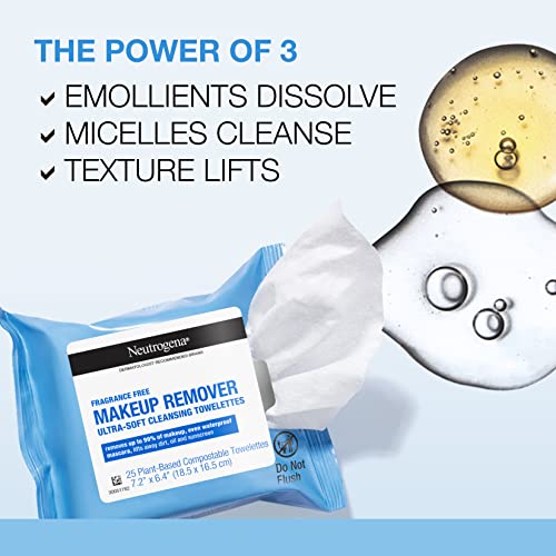 Cleanse skin and remove makeup in one easy step with Neutrogena Fragrance-Free Makeup Remover Wipes. These soft and gentle pre-moistened and unscented facial towelettes effectively cleanse to dissolve all traces of dirt, oil and makeup–even waterproof mascara– for clean, fresh looking skin every day. Our waterproof makeup remover features an effective micellar-infused, triple emollient formula that leaves skin feeling refreshed, nourished, conditioned and thoroughly clean with no heavy residue. These facial wipes also remove sweat, sunscreen, and pollution from skin with no need to rinse after use. These daily face wipes are formulated to be gentle on the sensitive eye area. The hypoallergenic makeup removing wet wipes are formulated without phthalates, parabens, sulfates, alcohols, soaps, fragrances or dyes and are ophthalmologist-, dermatologist-, and allergy-tested. Designed with the earth in mind, the home-compostable wipes are made with 100% plant-based fibers.