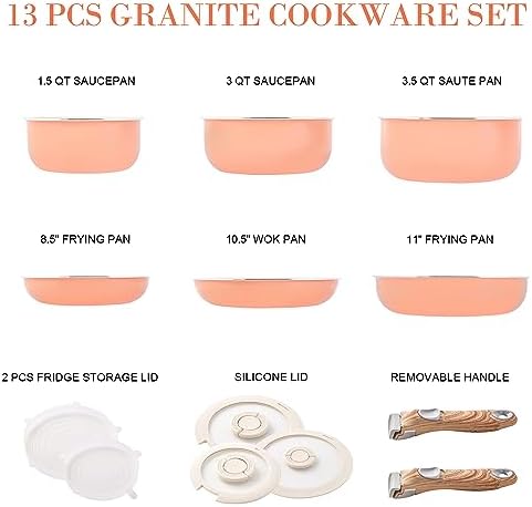 【What’s in The Box】- 8.5″ Fry pan, 11″ Fry pan, 10.25″ Wok Pan, 1.5QT Saucepan with 1 storage lid and 1 glass lid, 3QT Saucepan with 1 storage lid and 1 glass lid, 3.5QT Saute Pan with 1 glass lid, and 2 removable handles. The stylish aluminum pans with lids meet all your kitchen and family needs.