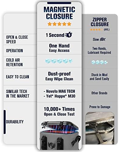 GUARANTEED PERFORMANCE – Crafted from water-resistant material, the cooler is durable, easy-to-clean, and sand-resistant. Its magnetic lid and dual buckles ensure unrivaled leakproofness in various outdoor environments.