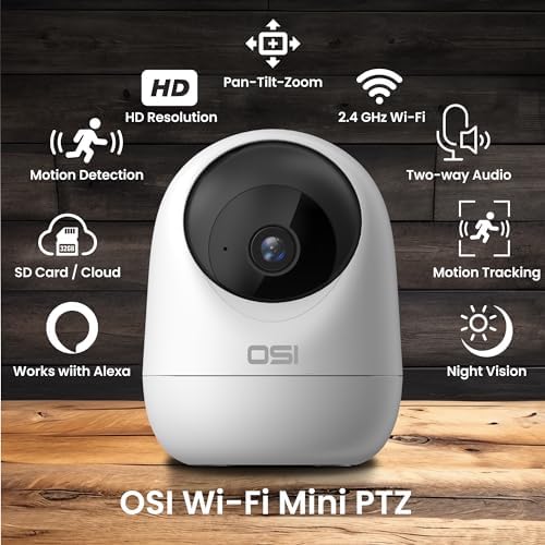 Pan-Tilt-Zoom functionality: Adjust camera’s orientation & focus from the smartphone for flexible view of surroundingsAuto tracking: Automatically follows and focuses on moving objects or subjects. Intelligent motion/audio detection: Automatically identifies unusual activity or audio cues and sends phone notifications to alert the audio and movements that matter in your camera’s field of view.Two-way audio: Users can both listen to and talk with individuals near the camera. Stay connected with two-way audio. Comfort your loved ones, talk to kids, soothe pets, and ensure elderly family members are never alone. High definition day & night 1080P (1920 x 1080): 2.1-megapixel resolution brings you a clear view of your property at all times making it easier to recognize faces.32 GB SD card included: The included 32 GB SD card, ensures ample storage for video recordings.Place it Anywhere: Place it on any surface such as desk or book shelf or conveniently install it on the ceiling or wall using the included bracket (bracket screws on to wall or ceiling with 2 included screws and wall anchors you may need USB-C Cable to reach the electrical outlet)Two-Way Audio Speaker and Microphone: The OSI Smart Mini PTZ Camera allows you to communicate through your security floodlight with its integrated two-way speaker. Alert intruders, communicate with delivery people, and greet your guests without ever opening your door!Night Vision: IR night vision up to 32 ft. for extreme low light coverage, ensuring your high-quality view of your home even in the dark. Cloud (Storage Available- If you rather have your video stored in the cloud rather than on the included 32GB SD card, you can sign up for cloud service for a low annual fee. The cloud service is 100% secure with advanced encryption and user credential requirements to ensure your safety and privacy).32GB SD Card Included: Built-in microSD slot with included 32GB SD Card (Max up to 128GB SD Card can be used) for easy local storage to keep all your important footage.Live Stream from Anywhere with Smart Life App: View and manage your footage remotely with the free Smart Life mobile app and stay alert to any significant event on your property with motion detection push notifications.Easy Set-up: Simple plug-and-play set up – no drilling required. All you need to do is plug the Micro USB end into the camera and plug the other end into an electrical outlet.Works with Alexa and Google Assistant: Use “Alexa” or “Google” voice commands with this camera to automatically view on the Echo Show or Google Nest Hub /Max.