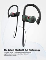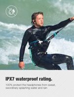 IPX7 Waterproof Rating.With ergonomic design and silicone ear hooks, wireless headphones secure stay on your ears, feel great to wear and will never fall out. Upgraded Waterproof Rating, 100% prevents ordinary splashing water and rain.