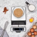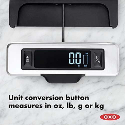 Stainless steel is Smudge- and fingerprint-resistant zero function for taring the scale before weighing additional ingredients digital screen with large, easy-to-read numbers, removable platform for convenient cleaning pullout display prevents shadowing from large plates or bowls unit conversion button to measure in oz, lb, gram or kg Chart: max weight: 11 lb/ 5 kg increments: 1/8 oz/ 1-g.