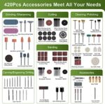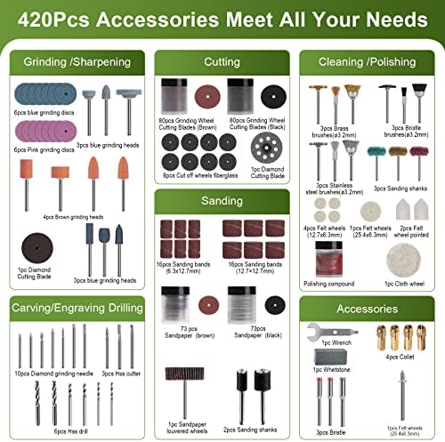 【420 Pcs Accessories Meet All Your Needs】 The carefully selected 420 Pcs 1/8″(3.2mm) accessories with strict quality control ,include cutting wheels, sanding bands, grinding wheels&needles, Hss cutter, brushes, drill bits, felt wheels and more. Very suitable for processing or DIY of for Cutting, Sanding, Grinding, Sharpening, Engraving, Carving, Drilling, Polishing and Cleaning etc. Can be used for wood, glass, ceramic tiles, plastic, metal, etc. Meet your various application requirements.