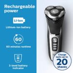 Shave for up to 60 minutes on a 1-hour charge – that’s about 20 shaves – with the powerful Li-ion battery. A 5-minute quick charge gives enough power for one shave. Operates in cordless mode only.