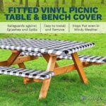 HEAVY DUTY, WATERPROOF VINYL CONSTRUCTION- The tablecloth and bench cloths are made with heavy duty vinyl that is waterproof, stain resistant, spill-proof and easy to clean. Under the vinyl, our cloths are reinforced with soft flannel backing so that they do not slip off or skid while using.