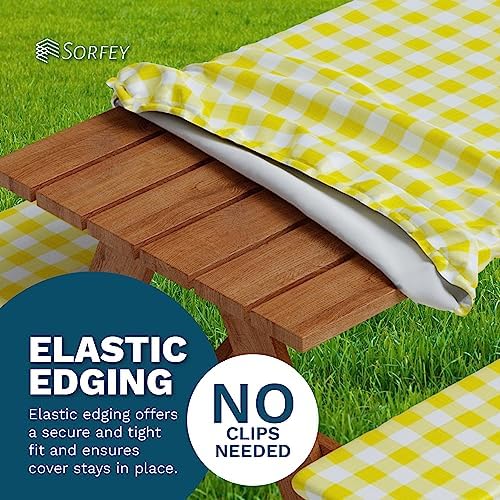 THICK, ELASTIC, STRETCHABLE DESIGN- Enjoy the perfect, snug fit for picnic tables, trade show tables or any folding table. The smartly incorporated elastic, stretchable corners will keep our table and bench cloths put, no matter what- no more messy accidents when the wind blows, no more tugging or pulling around the table and NO CLIPS NEEDED.
