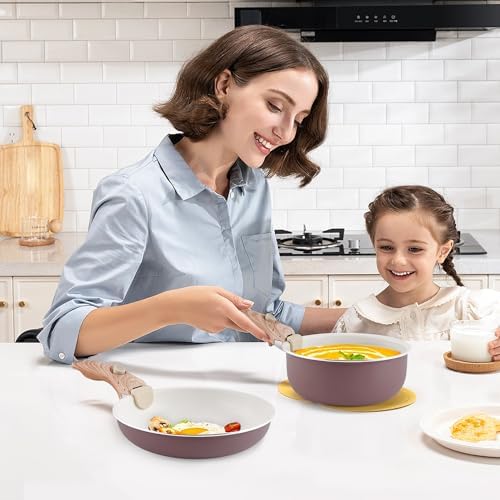 【Naturally Nonstick】- Free of PTFE, PFOA, PFAS, lead, and cadmium. And no more sticky or difficult-to-clean problems. The pots and pans set nonstick require less oil or butter for cooking and minimal scrubbing for a spotlessly clean, giving you a healthier and easy at home culinary experience.