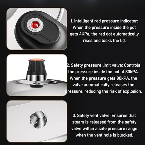 1. Intelligent red pressure indicator: When the pressure inside the pot gets 4KPa, the red dot automatically rises and locks the lid.