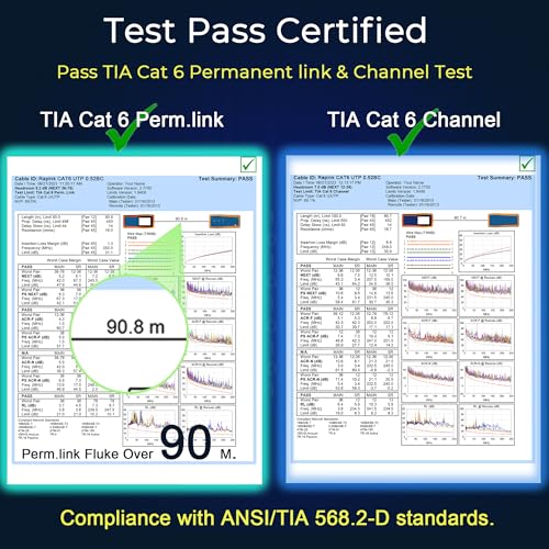 Test Pass: Cat6 ethernet cable pass both in TIA Cat 6 Perm.link and Channel Test (with Rapink patch cables) for project standard. Use cat6 ethernet cable 1000ft with confirdence for office network, residential network and home network project. Cat6 cable 1000ft are in compliance with ANSI/TIA 568.2-D standards.