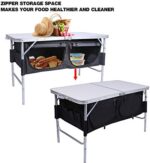 【Large Capacity Lockers】Our picnic table has a large storage locker for all kinds of food, drinks or cutlery. The Locker is made of durable 400D oxford fabric. Its zipper design prevents items from falling out. Two pieces of wood help improve load bearing.