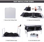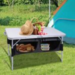 【Sturdy and Stable】The outdoor camping table with storage compartment is made of durable MDF table top and 25mm aluminum tube. U-shape frame at the side and security latch make the table stable to use. It can hold up to 70LBS.