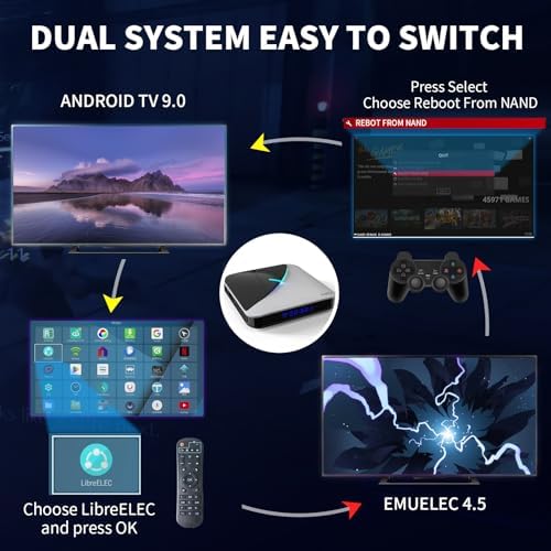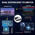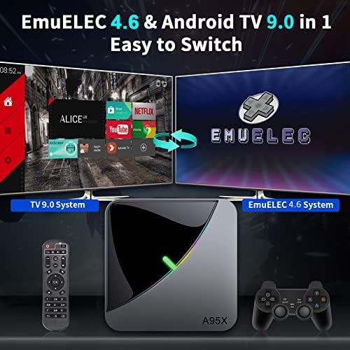 ✨[Dual System in 1] Game consoles are equipped with the latest EmuELEC 4.6 gaming system + Android TV 9.0. Easy to switch between watching TV and playing games, Google Play, Netflix, HBO, Plex, Emby and more APPs for your convenience