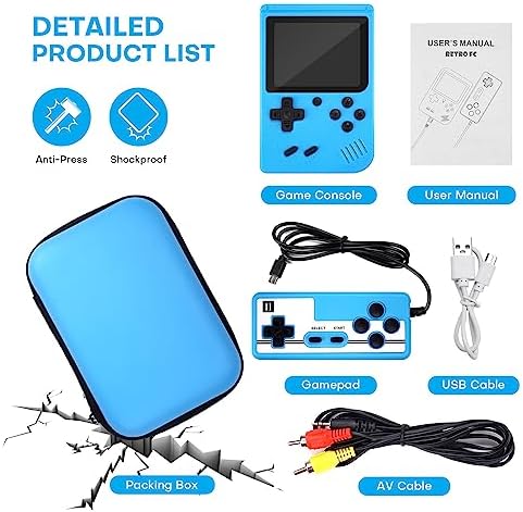 【Function kit 】The kit consists of a Retro Handheld Game Console with 400 games as well as an additional Game controller,USB cables,AV output cable,1020 mAh battery and User Manual.Handheld Game Console measures 5.9x 3.9 x1.9 in and is therefore compact and handy, so it fits comfortably in a bag of a backpack or jacket.