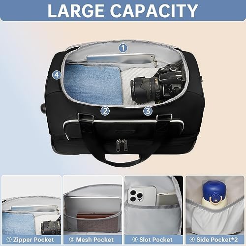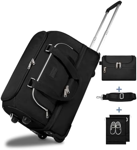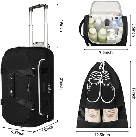 【Carry on Bags For Airplanes】 Dimensions:21*14*9.5 inches. Weight: 5.15lb; The wheeled duffel bag meets most international carry-on requirements. Fits in the overhead compartment as well as the under seat as Personal Items in flight.The large duffle bag equipped with aluminum alloy rod and antiskid rubber wheels, making airport travel a breeze. Your ideal flight approved travel bag for business or personal travel.