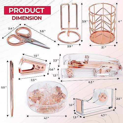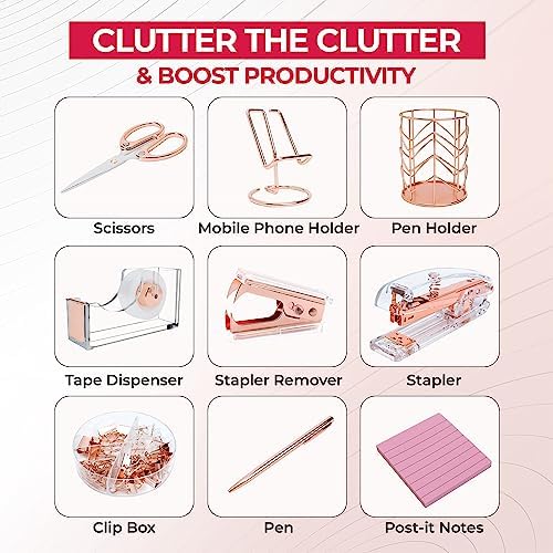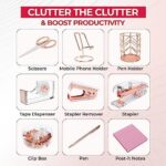 Clutter the Clutter & Boost Productivity … Sail through the workday & avoid interruptions by having the essentials right next to you. You’ll receive a rose gold tape dispenser, stapler, scissors, pen holder, pen, stapler remover, clip box, and phone holder.