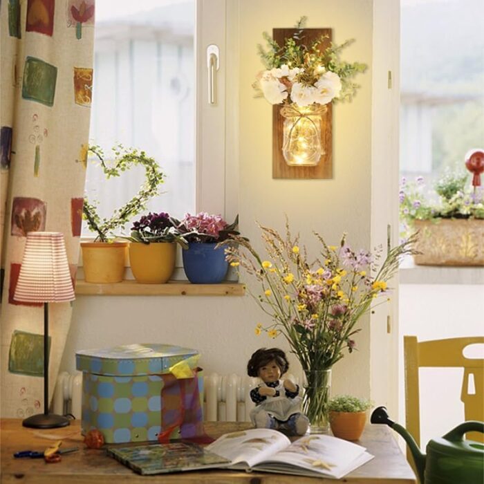 WARM SCONCE DECOR: As decorative swags hanging a mason jar sconce at home, hallway, kitchen, bedroom wall. Mason jar with string lights emit a magical, warm glow; This beautiful and rustic wall decor will fully capture your attention.