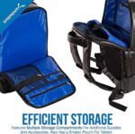 The backpack features multiple storage compartments and features for additional supplies and accessories. The backpack also has a smaller pouch for tablets.
