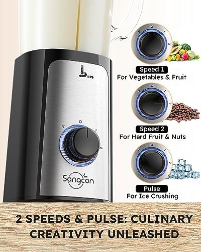 ☕【SIMPLE AND PRACTICAL】The Sangcon 5-in-1 Kitchen Blender offers endless possibilities with its 4 containers, and 3 blade types, The motor switch is equipped with a blue LED light, and there are 2-speed options and a pulse mode to bring you endless possibilities. From smoothies and milkshakes to fruit juices, vegetable juices, pesto, sauces, minced meat, peanut butter, almond/soy milk, coffee powder, spice powder, and more, this blender can handle a wide range of tasks.