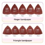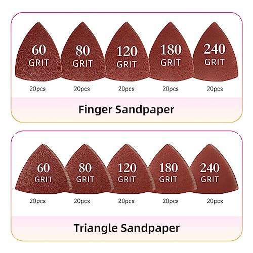 100pcs Triangle Sandpaper: 20pcs triangular Sandpaper 60 grits, 20pcs triangular Sandpaper 80 grits, 20pcs triangular Sandpaper 120 grits, 20pcs triangular Sandpaper 180 grits, 20pcs triangular Sandpaper 240 grits.