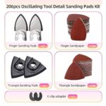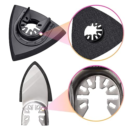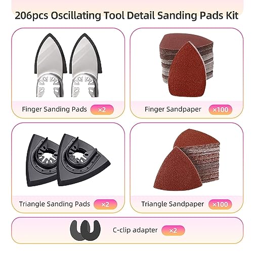 Oscillating tool sanding pad kit: 2pcs Multi-Tool Triangle sanding pads , 100pcs 80mm x 80mm x 80mm triangular sanding papers,2pcs finger sanding pads , 100pcs 40mm x 50mm x 50mm finger sanding papers,and 2 C-clip adapter.