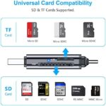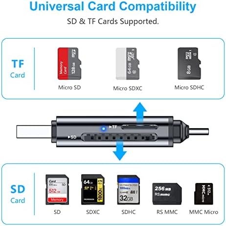 【Dual Card Simultaneous Access】This card reader supports simultaneous reading of dual cards, avoiding repeated card insertion and removal, speeding up file transfer and making data access more efficient. Compatible with SD / Micro SD / TF / SDHC / SDXC / Micro SDHC / Micro SDXC / MMC cards etc.
