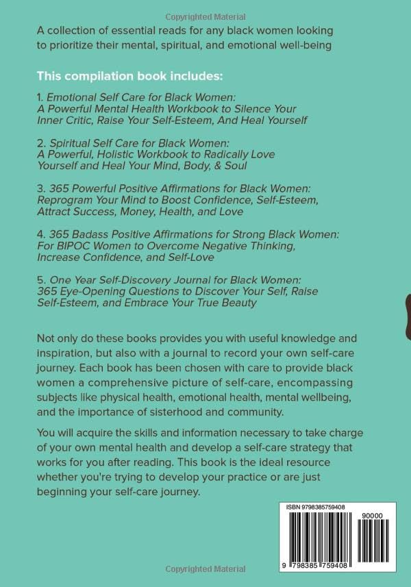 Emotional Self Care for Black Women: A Powerful Mental Health Workbook to Silence Your Inner Critic, Raise Your Self-Esteem, And Heal YourselfSpiritual Self Care for Black Women: A Powerful, Holistic Workbook to Radically Love Yourself and Heal Your Mind, Body, & Soul365 Powerful Positive Affirmations for Black Women: Reprogram Your Mind to Boost Confidence, Self-Esteem, Attract Success, Money, Health, and Love365 Badass Positive Affirmations for Strong Black Women: For BIPOC Women to Overcome Negative Thinking, Increase Confidence, and Self-LoveOne Year Self-Discovery Journal for Black Women: 365 Eye-Opening Questions to Discover Your Self, Raise Self-Esteem, and Embrace Your True Beauty