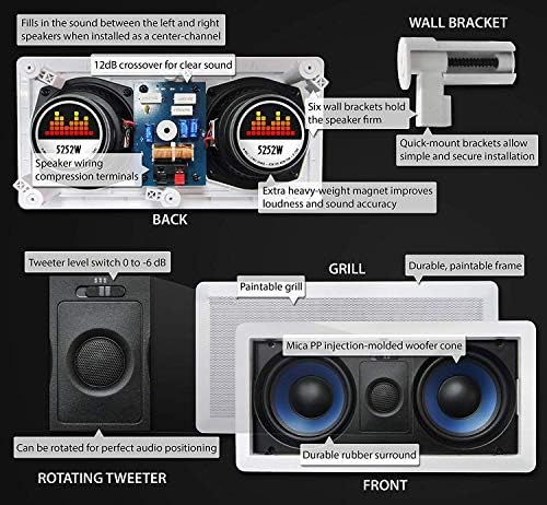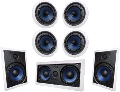 1 x 5252W in wall center channel, 2 x 82W in wall Left and Right Channel, 4 x 82C in ceiling surround speakers.