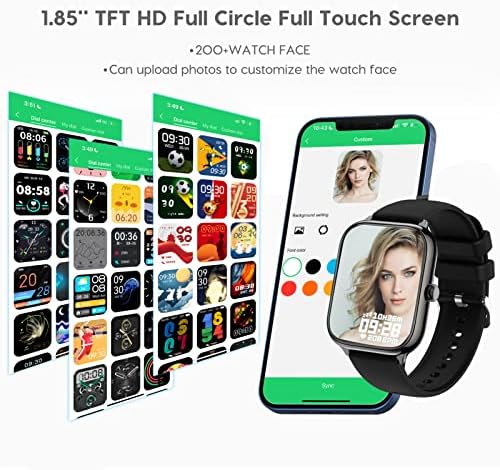 【1.85 in HD Full Touch Screen&200+Watch Face】A popular smartwatch for men and women, with a large 1.85 inch ultra high definition full touch screen with higher colour saturation and a more detailed and clear picture quality, bringing you a more open visual enjoyment. It is more visually appealing than the 1.75 inch screen. The watch has 5 built-in dials and over 200 dials in the cloud that can be downloaded to the watch, you can also upload your favourite photos as dials for the watch.