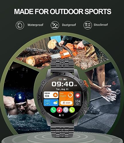 🔋 380mAh Long-lasting Battery Life 🔋 The men’s military smartwatch has a 380mAh battery that offers powerful performance and ensures all-day use. This high battery capacity smartwatch ensures it can keep up with your active lifestyle. Whether you want to monitor your fitness activities, get important notifications or stay connected with your loved ones.