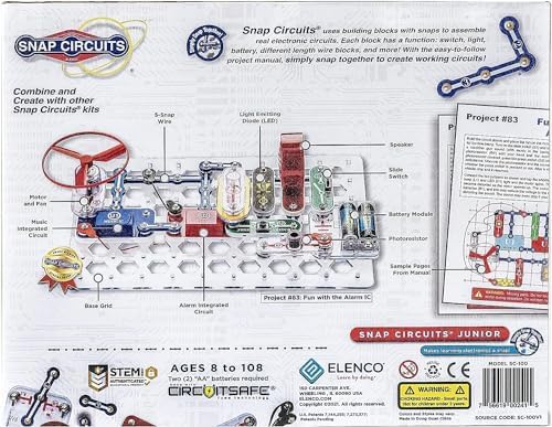 Create Working Electronic Circuits Snap Circuits Jr (SC-100) comes with 28 components to create 100+ different electronic projects. The pieces, which include snap wires, slide switches, an alarm circuit, a music integrated circuit, and a speaker, snap together easily on the included plastic grid–no soldering required. Each piece is numbered and color-coded to make identifying them easy. These components combine to create working circuit boards just like the ones found inside televisions, radios, and other electronic devices. With its easy-to-follow instructions, Snap Circuits gives your child a hands-on education in how electrical circuits work to run the everyday devices that they’re familiar with. They’ll also gain valuable lessons in building and in following instructions. The project manual includes large color illustrations and simple directions for each project. The projects include a sound-activated switch, a musical doorbell, a voice-controlled lamp, a flying saucer, and a light police siren. With these projects, children will experiment with things like electric switches, integrated circuits, digital circuits, fuses, and the transformation of circuit sounds into other sounds. Includes: Plastic snap-grid, 32 electrical components, and 1 project manual. Recommended for children 8 years and older.