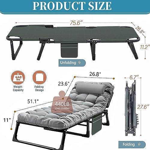 [Safe and Comfortable]: Our folding Adjustable cot with mattress beach lounger is designed with anti-slip feet pads to ensure stability. The folding camping cot also has a removable pillow and Side pocket , which provides comfortable support for your neck and head to help you fall asleep quickly.