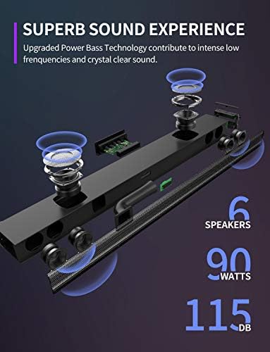 FEATURES UPDATED DIFFERENT EQUALIZER MODES – With its 4 distinct sound modes adjusting by using the included remote control, you can fine-tune your audio to match the perfect sound to your ears. Set the sound bar between Music, Movies, News, or 3D surround sound mode to hear and feel every explosion, instrument, dialogue, and detail with clear and ear-pleasing loudness. Feel and enjoy the surround sound system for tv.