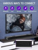 MULTIPLE INPUT CONNECTIONS AND EASY SETTING UP – Our sound bar for TV is powered with integrated inputs to bring all media in life with amplified audio. It can easily connect with TVs, projectors, computers, Blu-ray players, tablets, PS5, Amplifiers, and more via RCA, AUX, USB (Flash drive only), HDMI ARC and Optical input. A premium 5 ft Optical cable and 5 ft RCA cable are included in the package.
