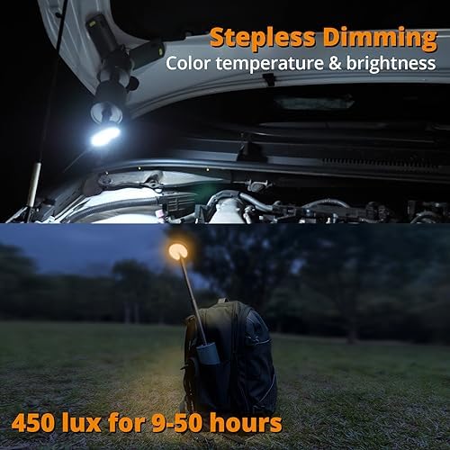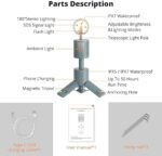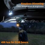 【Extendable & Multi-Angle】 Segmented design of this telescopic camping light, break the limitations of traditional camping lights, the lamp head can be turned 180 degrees, with the overall expansion and contraction range of 10″~36″, offering more lighting options, such as desk lamp, searchlight, night light or work light. Retract the light head, the middle section is equipped with a light divergence area for ambient light, help you chill down to enjoy your camp night.