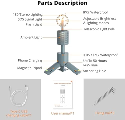 【Stable Tripod & Magne Bottom】 Lightweight and high-density materials, adjustable tripod can support it to stand firmly on grass, mud, gravel, rocks and other surfaces. Three fixing nails are coming with the package, embed the lights in the grass together with your tent to adapt to various terrain. The magnetic bottom allows the light firmly attach to the car or the metal stand of tent, and can be used as a work light or a rescue signal, or a tent ceiling light.