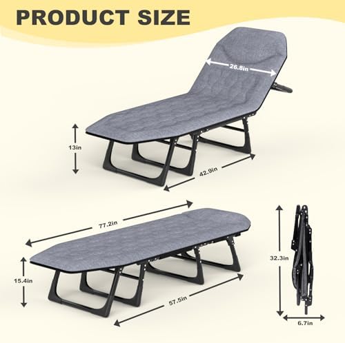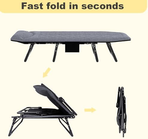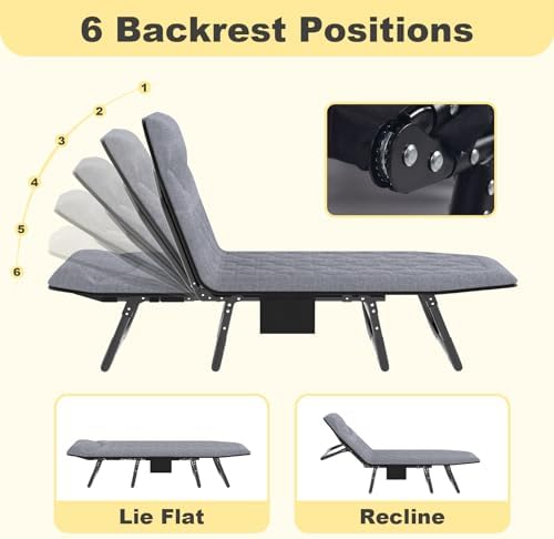 【Portable and Versatile】This folding chair cot bed free assembly, it can be unfolded for use, and can be folded up in seconds. The folding design is easy to store and carry. Great for office naps, sun tanning, beach, camping, patio, pool, balcony, or as a makeshift bed for guests. This is a versatile camping bed chair for adults and kids.