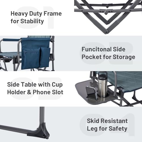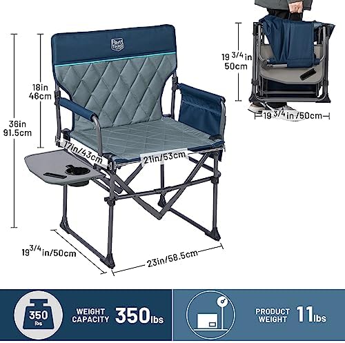 Heavy Duty and Comfortable: Constructed with sturdy metal frame, our directors chair with side table supports up to 350lbs and ensures the stability. 21 inch seat width is optimal for most people, and padded hard armrests offer you extra comfort and helps you to get up with less effort.