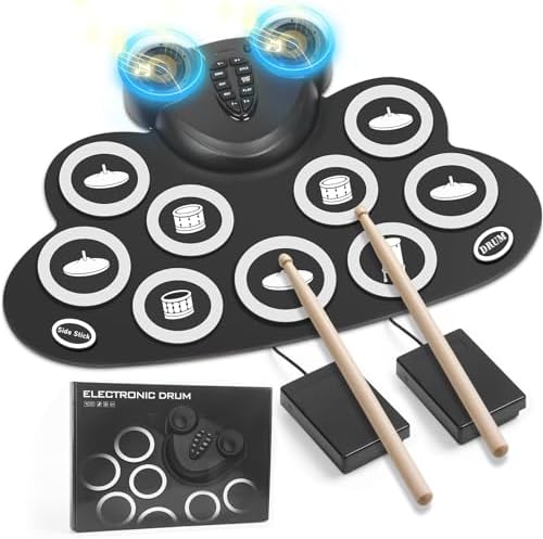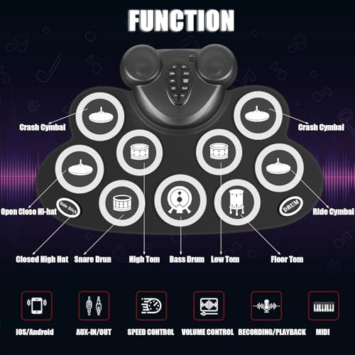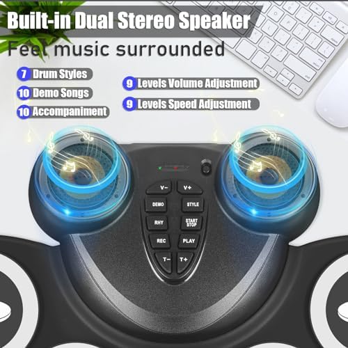 ⏺【2.2W Stereo Dual Speakers】 The electric drum pad has two fantastic stereo speakers that deliver the powerful, impactful sound you want.It support 9 levels speed adjustment and 9 levels volume adjustment according to your needs. Long recording function can record a drummer’s Moment of inspiration and enhance their creative potential.