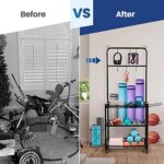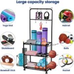 🏀【Large Capacity】– This ball storage garage organizer features 3 tier shelves with side storage, ideal to store sports gears like baseballs, basketballs, racket, skateboarding, yoga mat and more. With removable hooks, you can store baseball cap, gloves all in one storage stand.