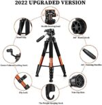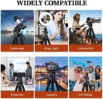 【Tripod for All Camera and Phone】Additional quick-release plates and phone mount maximize the compatibility to the greatest extent. Standard 1/4″ screw mount compatible with all cameras (Nikon D3500, Fujifilm X-T200, Canon EOS 250D, Olympus, Panasonic), DSLR, SLR, webcams, compact camcorders, digital cinema cameras, projector, ring light, spotting scopes, and binoculars. The 360° phone mount is compatible with iPhone 14 13 12 11/11 Pro/XS Max/XS/XR/X/8/8 plus/ Galaxy Note 9/S10/S20.