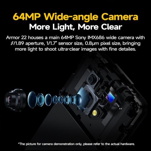 📷【64MP Rear Camera + 64MP Night Vision Camera 】Armor 22 rugged phone features 64MP ultra-high resolution image sensor armed with ISOCELL Plus and Smart-ISO technology, let you capture more detailed images and 4K video. Everything in the dark is clearly visible thanks to Infrared Night Vision 2.0. The 64MP night vision camera withtwo IR LEDsis agreat upgrade over the previous version and enables you to easily navigate and sight targets in low light or no light areas.