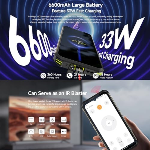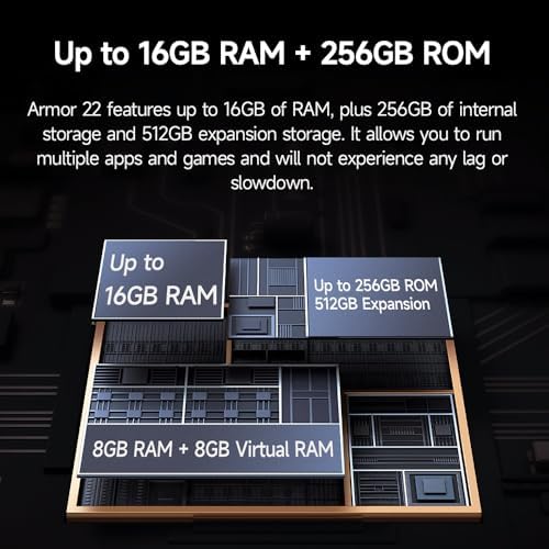 🚀【Up to 16GB RAM + 256GB ROM Smartphone + 512GB Expansion Support】With base 8GB RAM and 256GB ROM storage, the Android phone Ulefone Armor 22 excels in multitasking. And ulefone 22 outdoor smartphon with RAM expansion technology, 8GB fixed RAM and up to 8GB of virtual RAM allow multiple memory-hungry apps to run snappily at the same time. Besides, 256GB of internal storage plus a microSD card of up to 512GB provides ample space for more apps, files, photos, and videos.