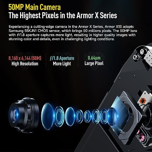 Experiencing a cutting-edge camera in the Armor X Series, Armor X13 adopts S5KJN1 CMOS sensor, which brings 50 millions pixels. The 50MP lens with f/1.8 aperture captures more light, resulting in higher quality images with stunning color and details, even in challenging lighting conditions.